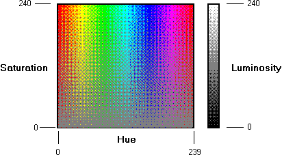 Dialogboksen farge inneholder kontroller for å angi HSL-verdier. Følgende illustrasjon viser spekteret kontrollen farge og lysstyrke skyvekontrollen som vises i dialogboksen farge . Illustrasjonen viser også verdiområder kan brukere med disse kontrollene.