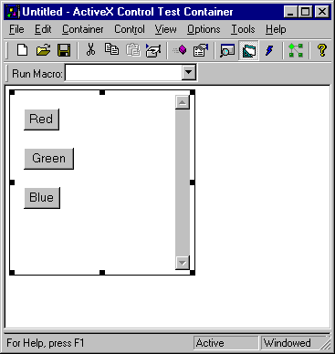 L'Assistant objet ATL génère un contrôle avec le code par défaut à la fois la ressource HTML et le fichier .cpp. Vous pouvez compiler et exécuter le contrôle qu'il est généré par l'Assistant et puis afficher le contrôle dans le navigateur web ou le conteneur de Test. L'image ci-dessous montre le défaut de contrôle ATL DHTML avec trois boutons affichés dans le conteneur de Test:
